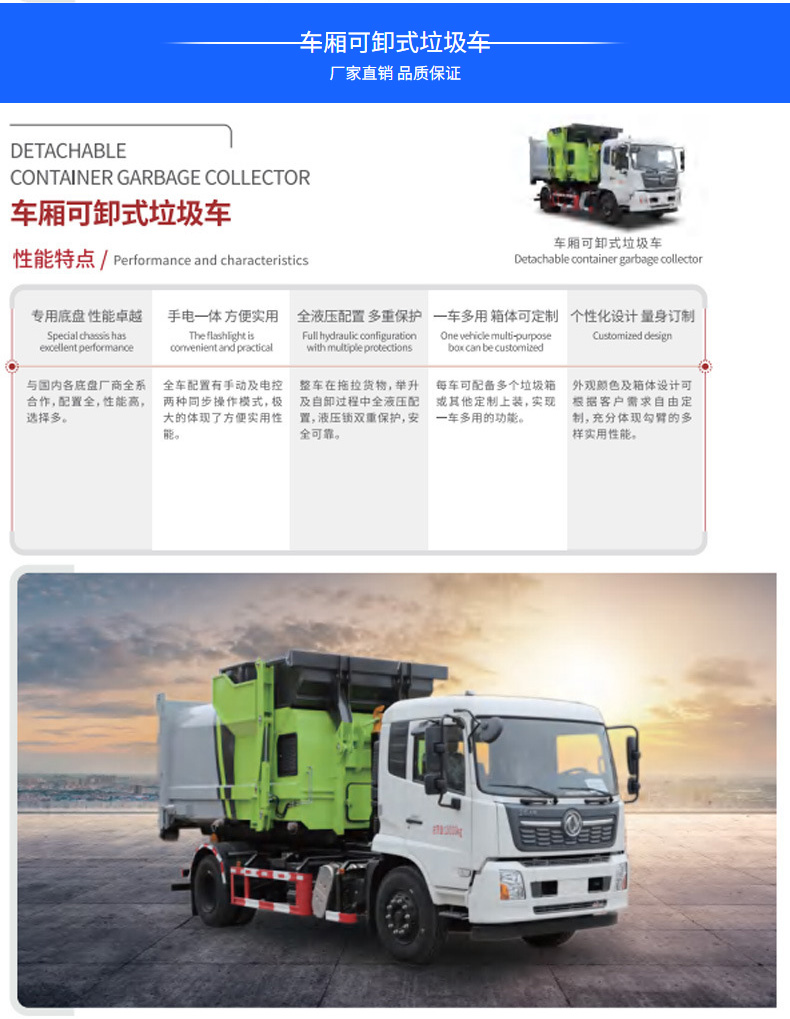 垃圾車價格_純電動垃圾車_東風(fēng)天錦純電動車廂可卸式垃圾車★13908669111★產(chǎn)品名稱CSC5180ZXXDBEV型純電動車廂可卸式垃圾車,采用東風(fēng)DFH1180BEV1底盤改裝而成,該車用于垃圾的收集清運,主要專用裝置為勾臂.整車美觀大方,全液壓配置多重保護能與大中型壓縮垃圾車或整體站無縫對接,提高經(jīng)濟效益。更多垃圾車盡在:m.pkubrand.cn