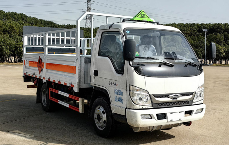 該車適用于運(yùn)輸危險(xiǎn)品,用于運(yùn)輸具有獨(dú)立容器(瓶)包裝的物品,運(yùn)送危險(xiǎn)類項(xiàng)號(hào):2.1,2.2.運(yùn)輸易燃?xì)怏w時(shí)掛2.1類警示牌,運(yùn)輸非易燃無毒氣體時(shí)掛2.2類警示牌.側(cè)、后防護(hù)材料均為Q235,螺栓連接,后防護(hù)截面尺寸(mm)φ100,下邊緣離地高430mm.液壓尾板收起狀態(tài)水平長度為280mm,尾板質(zhì)量為350kg.選裝后部無尾板時(shí),后防護(hù)材料為Q235,螺栓連接,截面尺寸(mm)100×50,下邊緣離地高430mm.僅選用排氣管前置、限速裝置(限速80km/h)、前輪盤式制動(dòng)及子午線輪胎的底盤;轉(zhuǎn)向輪裝備輪胎爆胎應(yīng)急防護(hù)裝置.安裝帶有衛(wèi)星定位功能的行駛記錄儀.ABS系統(tǒng)控制方式為4S/4M,氣剎:ABS型號(hào)為CM4XL-4S/4M,生產(chǎn)廠家為廣州瑞立科密汽車電子股份有限公司.液剎:ABS型號(hào)為CM4YL,生產(chǎn)廠家為廣州瑞立科密汽車電子股份有限公司.液剎:ABS型號(hào)為CM0953YL,生產(chǎn)廠家為廣州瑞立科密汽車電子股份有限公司.發(fā)動(dòng)機(jī)/油耗值(L/100Km)對(duì)應(yīng)關(guān)系為:Q23-115C60/11.40,Q23-115E60/11.12,Q23-132E60/11.17.僅選用軸距2850mm.整車外形尺寸長/后懸對(duì)應(yīng)關(guān)系為(mm):5540/1560,5450/1470,5250/1270.選裝直接供電式ETC車載裝置.整備質(zhì)量不含備胎,包含滅火器及隨車工具;貨箱重量540kg,480kg,貨箱材質(zhì)/厚度:底板Q235/3mm,槽鋼/2.5mm;墻板Q235/1mm.選裝尾板樣式.隨底盤選裝新前格柵及新logo.選裝新前圍及裝飾件、前部燈具等.選裝欄板樣式,廂體選裝無柵欄,選裝柵欄樣式,選裝貨箱欄板結(jié)構(gòu).