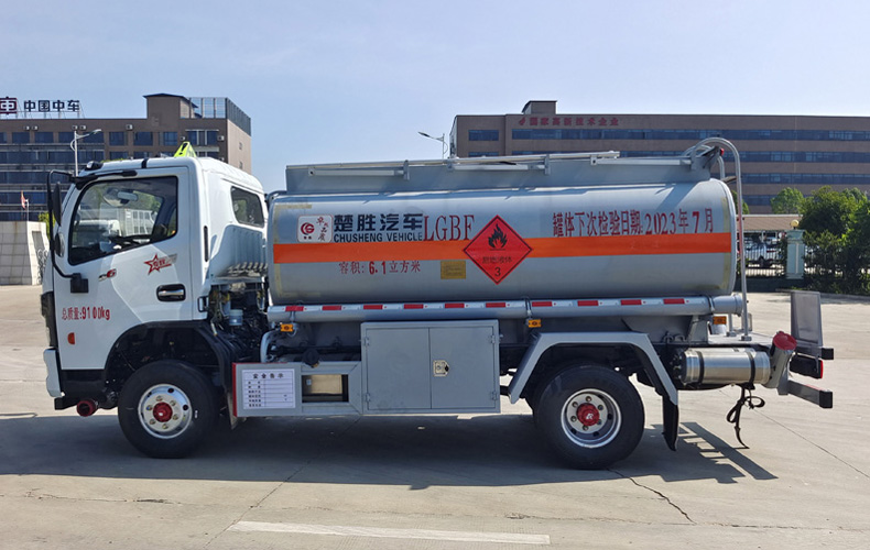 此款CSC5095GJY6A加油車罐體材質(zhì)為優(yōu)質(zhì)碳鋼板材生產(chǎn)制作,板材均為國內(nèi)一流鋼材廠家(寶鋼,武鋼)提供,封頭、阻浪板、隔倉板均采用蝶形,其中封頭及隔倉板厚度為5mm,筒體及阻浪板厚度為4.2mm,完全滿足國家標(biāo)準(zhǔn)GB18564.1-2019《道路運(yùn)輸液體危險(xiǎn)貨物罐式車輛 第1部分:金屬常壓罐體技術(shù)要求》的設(shè)計(jì)要求。整車帶全套嘉隆牌歐標(biāo)卸油系統(tǒng)(包含有油氣回收,氣動(dòng)組合開關(guān),防溢流探桿及五芯插座,歐標(biāo)人孔蓋,緊急切斷閥等),有效控制罐體的裝油量,帶海底閥聲光報(bào)警系統(tǒng),有效保證運(yùn)輸?shù)陌踩裕揄攷в谢顒?dòng)護(hù)欄及防滑網(wǎng),保障惡劣天氣下車頂作業(yè)人身安全。標(biāo)配卸料箱1個(gè),加油機(jī)箱1個(gè),工具箱1個(gè),4Kg滅火器2個(gè),整車貼有易燃液體標(biāo)識(shí),安全告示等。