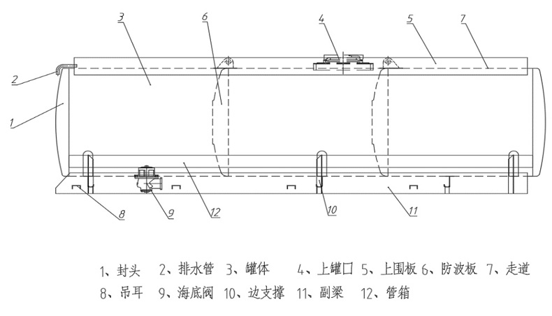 罐體結構為帶一定曲率的凸多邊形,采用優質碳鋼板焊接而成,主要由罐體、車架、人孔、圍板及卸料管道等組成。罐內設有縱向防波板,以加強罐體的剛性,并減輕因車輛加速及減速時液體介質的強烈波動和沖擊。罐頂設有圍板、人孔及呼吸閥,罐底設有海底閥。罐體由車架支撐,采用焊接型式將車架及罐體連接在一起。為防止銹蝕,罐體外表涂防銹漆及裝飾漆。